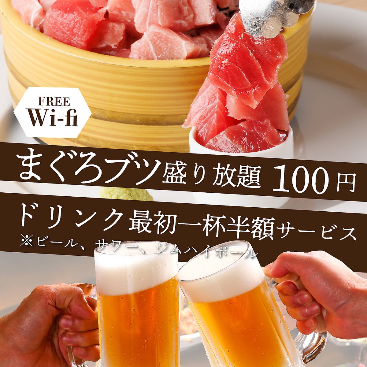 まぐろブツ盛りが100円や乾杯ドリンクサービスが半額サービス♪
